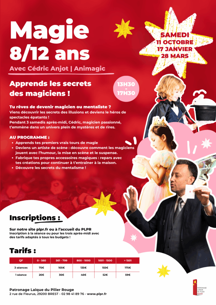 Vous cherchez une activité originale et ludique pour vos enfants à Brest ? Le Patronage Laïque du Pilier Rouge propose un atelier de magie spécialement conçu pour les enfants de 8 à 12 ans. Animé par Cédric Anjot (Animagic), magicien passionné, cet atelier leur permettra de découvrir les secrets des illusionnistes et de devenir les héros de spectacles époustouflants !
