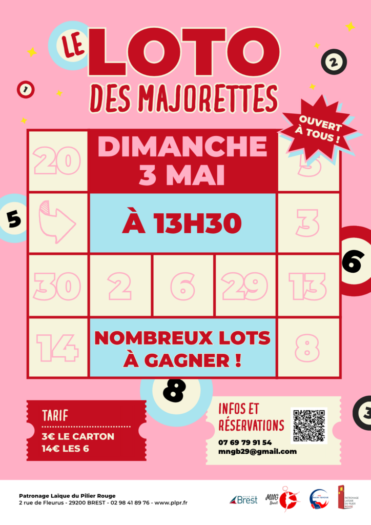 Le Loto des Majorettes débarque à Brest ! Rendez-vous le dimanche 3 mai 2026 à 13h30 au Patronage Laïque du Pilier Rouge pour une après-midi de jeux et de joie avec de nombreux lots à gagner.