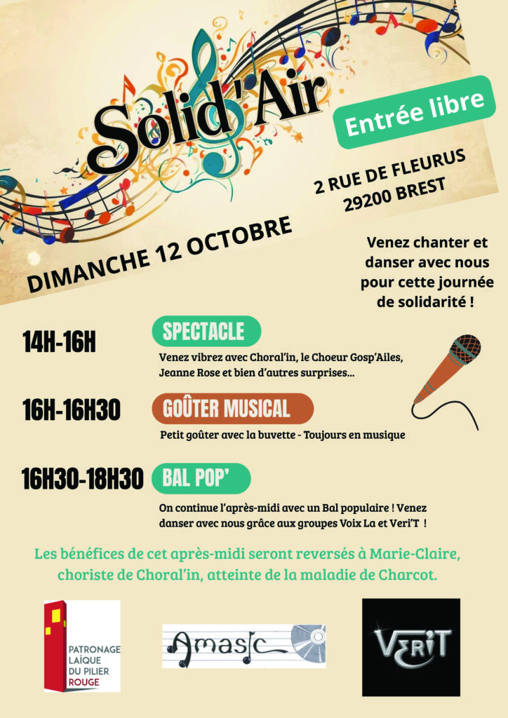Vous aimez la musique, le chant et la danse ? Ne manquez pas Solid’Air, un événement festif et généreux organisé pour soutenir Marie-Claire, choriste de Choral’in atteinte de la maladie de Charcot.